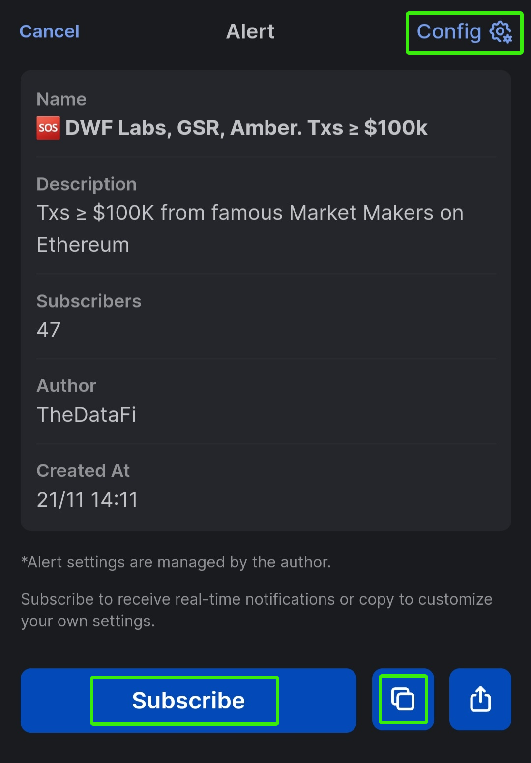 Before subscribing, you can check its description and **Config** by tapping an alert.