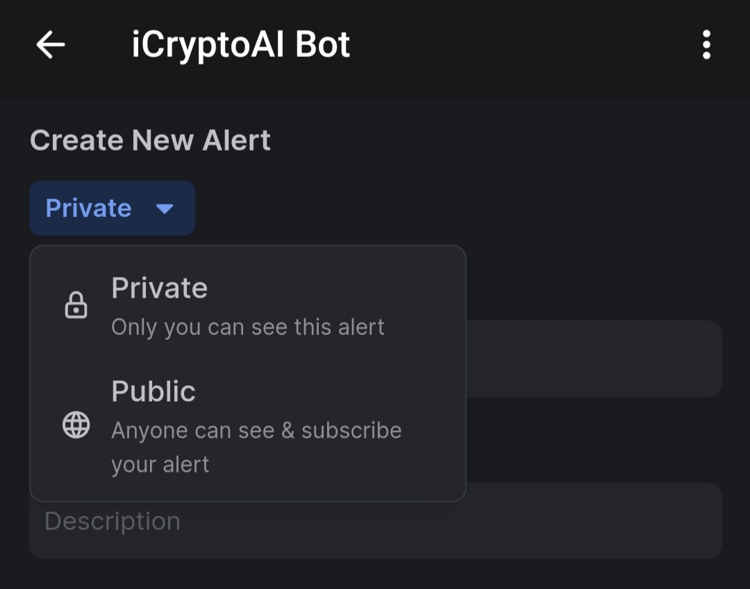 By choosing **Public**, you allow other users to see its settings and subscribe to your alert. &#x20;