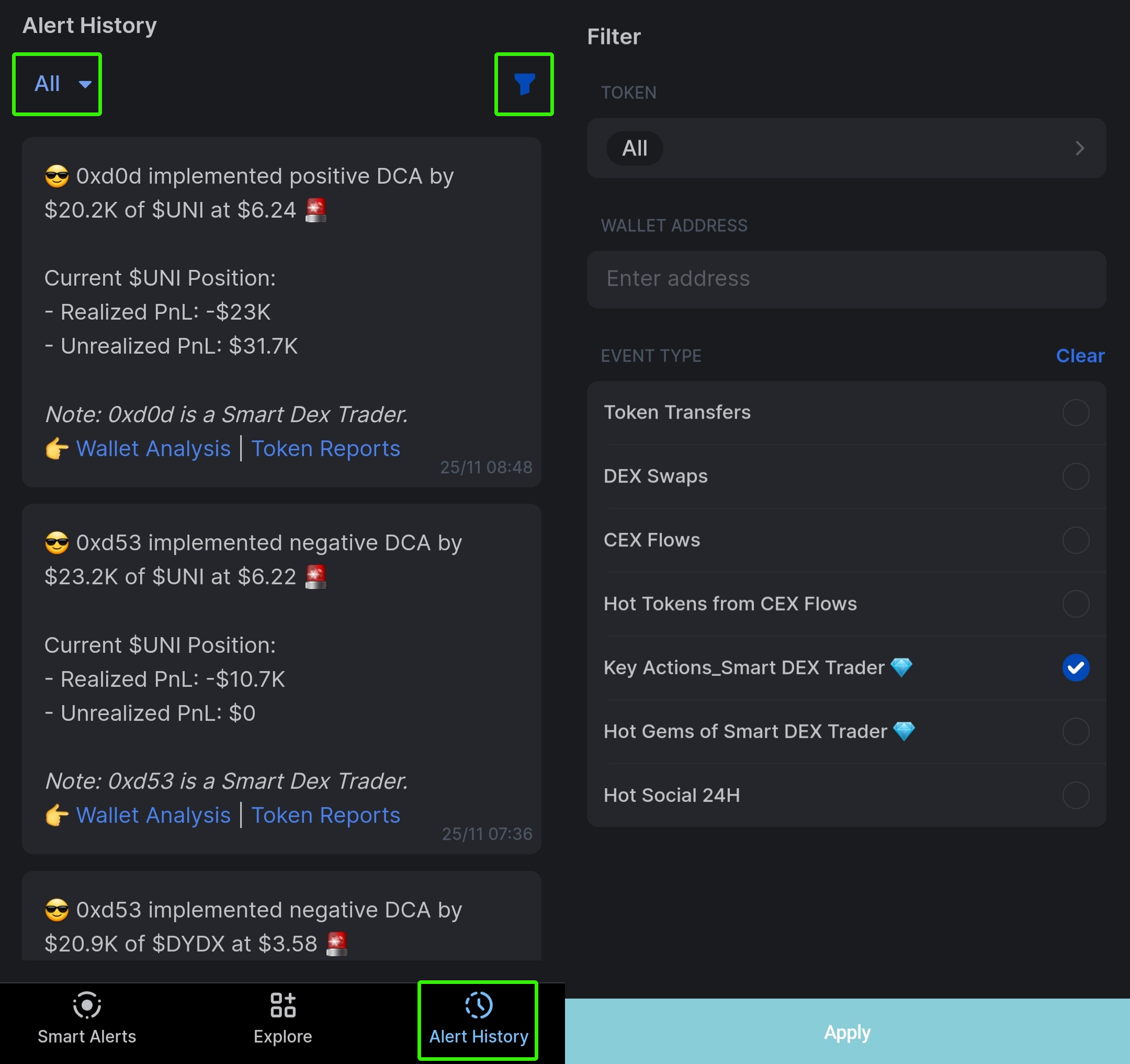 You can also filter out unneccessary alert types, tokens, wallet addresses and event types.