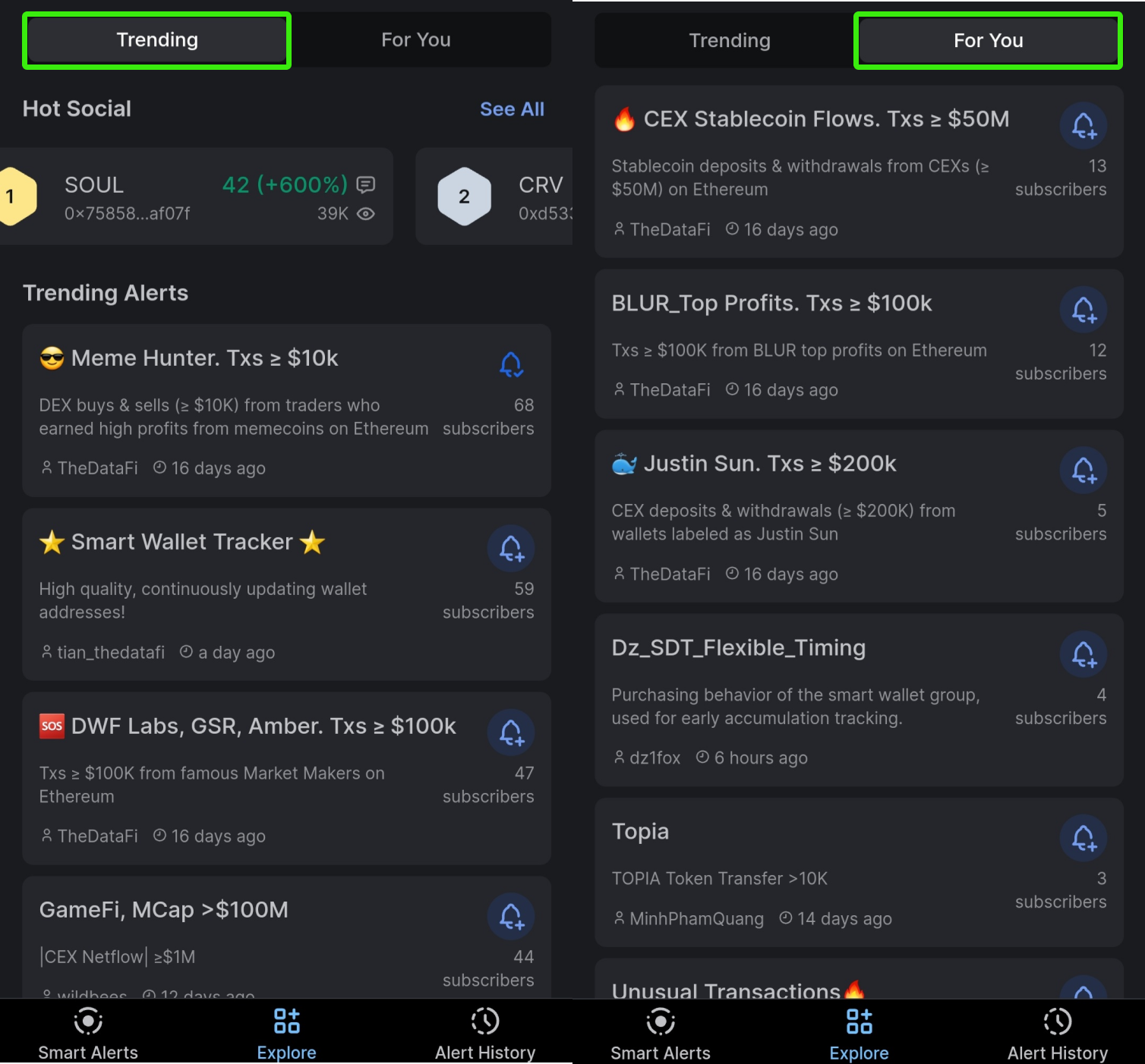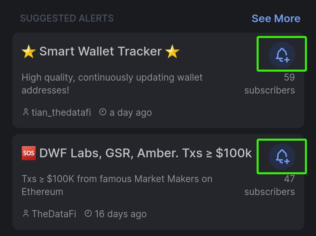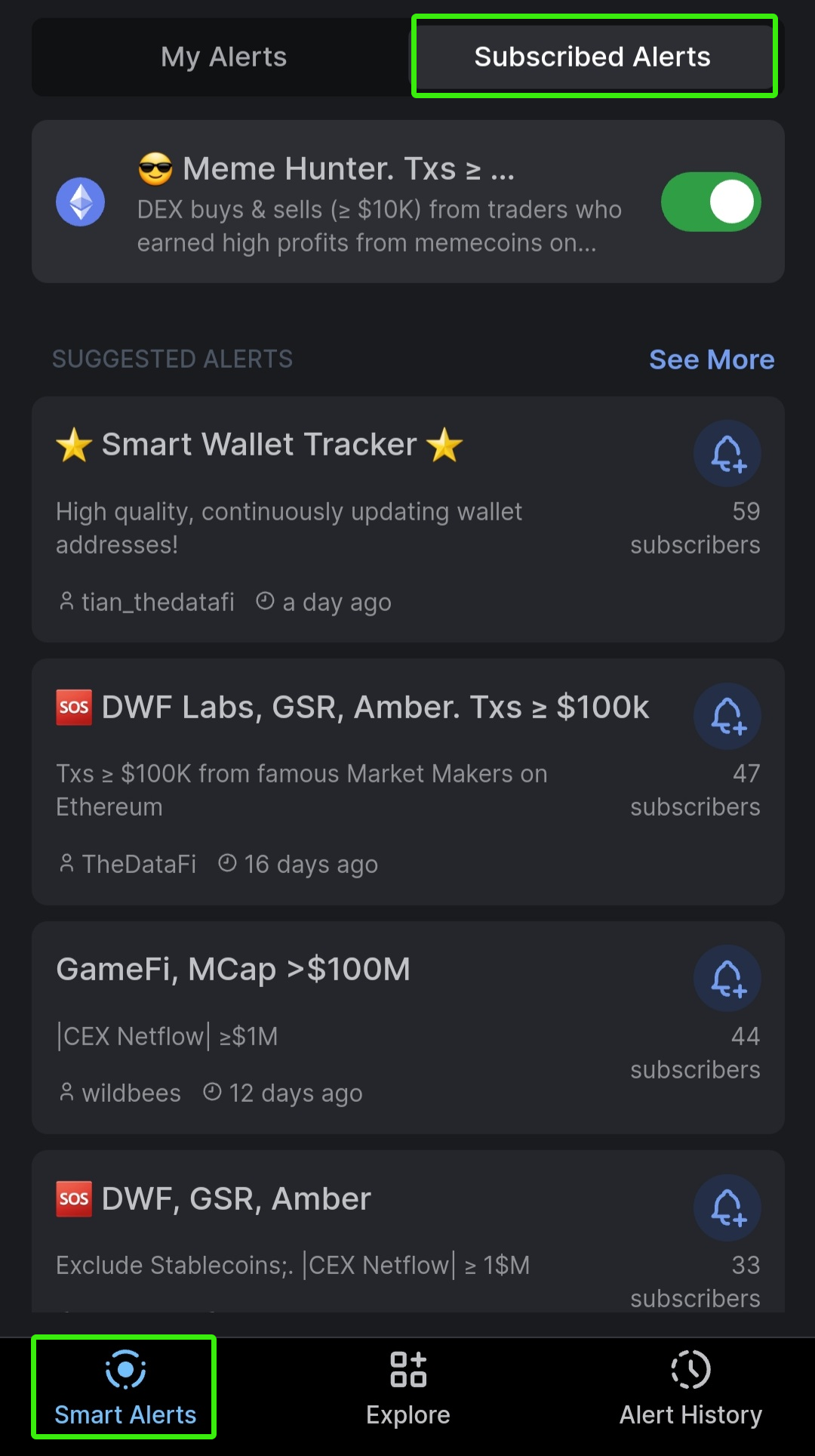 Section **Explore** allows you to see and subscribe to alerts from other users, especially from crypto experts who got most subscriptions.